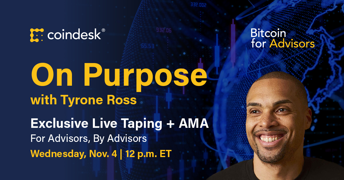 الآن هي فرصتك للسؤال: يدعو مضيف البودكاست On Purpose والرئيس التنفيذي لشركة Onramp Invest Tyrone Ross الجمهور إلى أول حفلة تسجيل بث مباشر في CoinDesk و AMA يوم الأربعاء 3 نوفمبر.