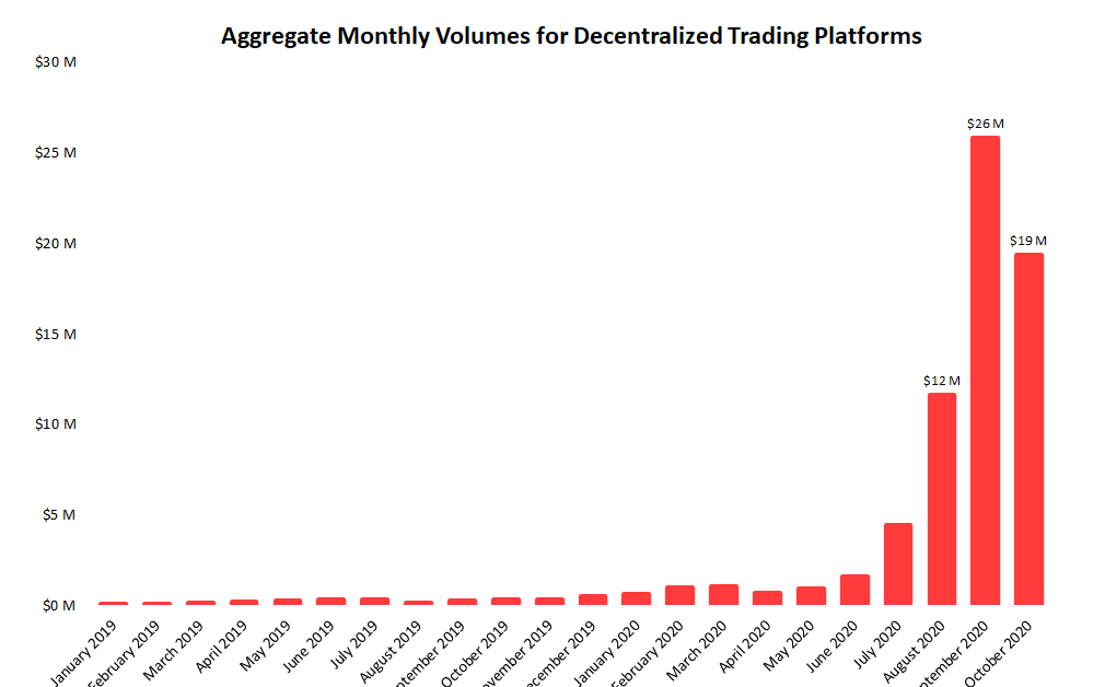 انخفض حجم التداول الشهري في البورصات اللامركزية للمرة الأولى منذ أبريل ، حيث انخفض بنسبة 25٪ بعد ثلاثة أشهر متتالية من مضاعفة الحجم الإجمالي خلال الربع الثالث ، وفقًا لـ تحليلات الكثبان الرملية.