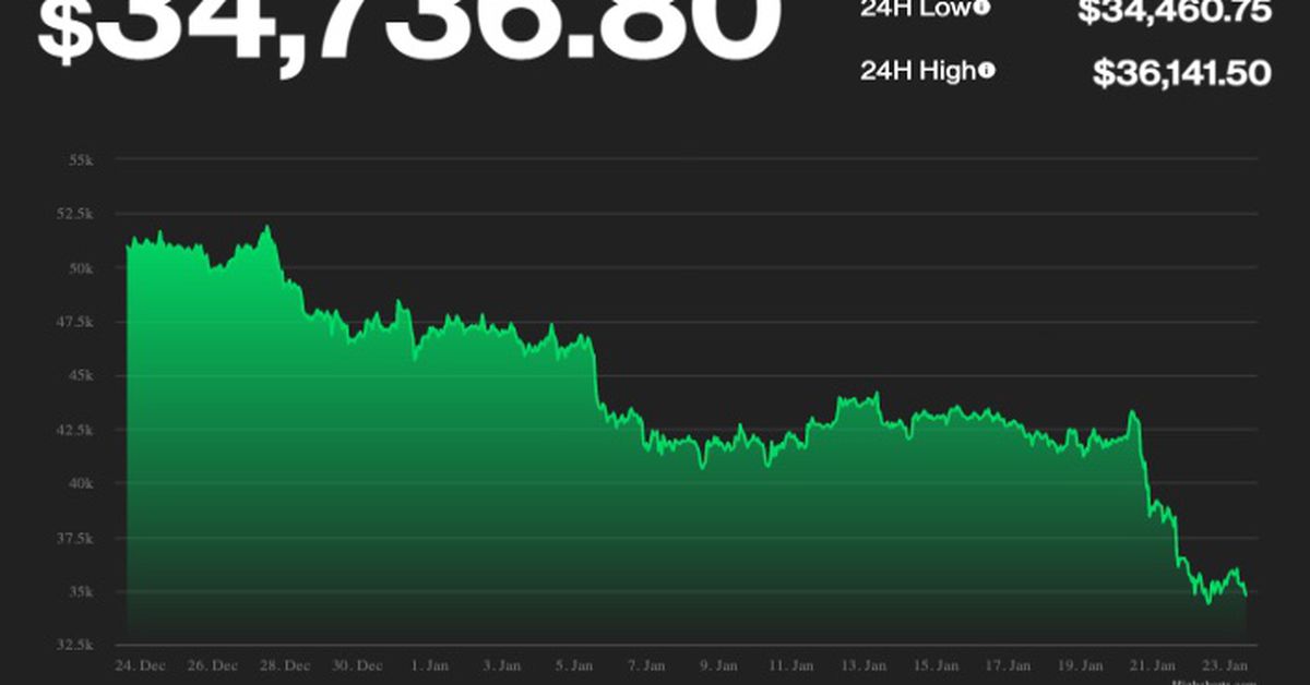اعتبارًا من وقت النشر ، كانت عملة البيتكوين (BTC) يتم تداولها بأقل من 35000 دولار ، بزيادة 1.6 ٪ خلال الـ 24 ساعة الماضية. تم تصفية أكثر من 1.5 مليار دولار من مراكز تداول البيتكوين على مدار الأيام الثلاثة الماضية بسبب نداءات الهامش ، وفقًا لموقع البيانات Coinglass.